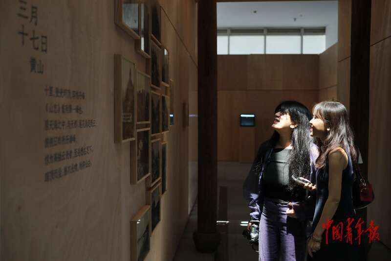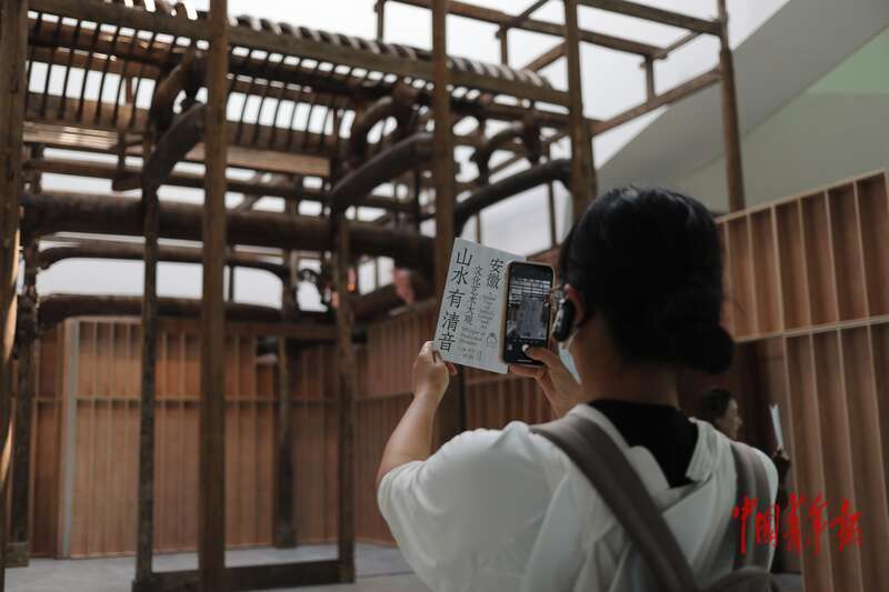 7月18日,北京民生美术馆,“山水有清音 安徽文化艺术大观”展览现场,参观者在展厅中的徽派建筑木结构复原件前拍摄票根留念。中青报·中青网记者 孔斯琪/摄