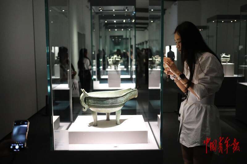 7月18日,北京民生美术馆,“山水有清音 安徽文化艺术大观”展览现场,参观者在拍摄一件出土于安徽省怀宁县的春秋时期青铜匜。中青报·中青网记者 孔斯琪/摄