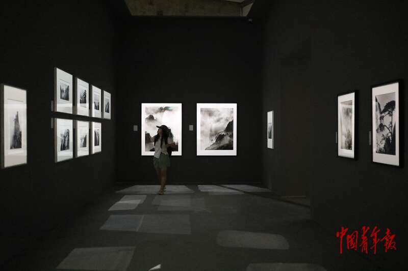 7月18日,北京民生美术馆,“山水有清音 安徽文化艺术大观”展览现场,参观者在观看郎静山等“黄山摄影流派”摄影家的作品。中青报·中青网记者 孔斯琪/摄