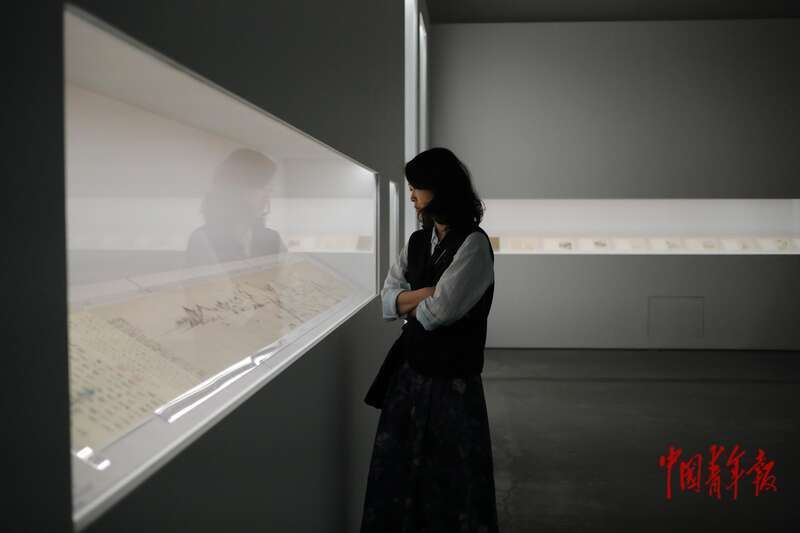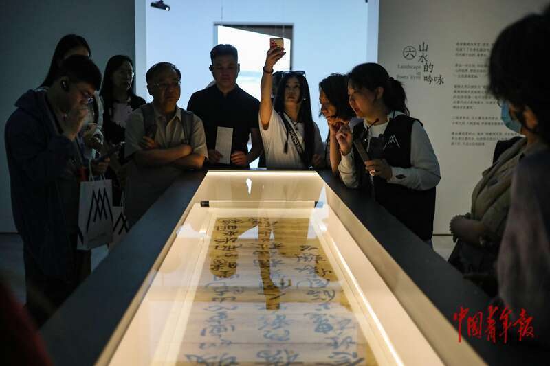 7月18日,北京民生美术馆,“山水有清音 安徽文化艺术大观”展览现场,参观者在观看一件描绘安徽山水风貌的卷轴画。该展分为“水、山、形势、人文”四个板块十二个单元,不是按照一般意义上的时间线来串联展品,而是尝试探讨安徽自然山水与人文创造之间的关联。中青报·中青网记者 孔斯琪/摄