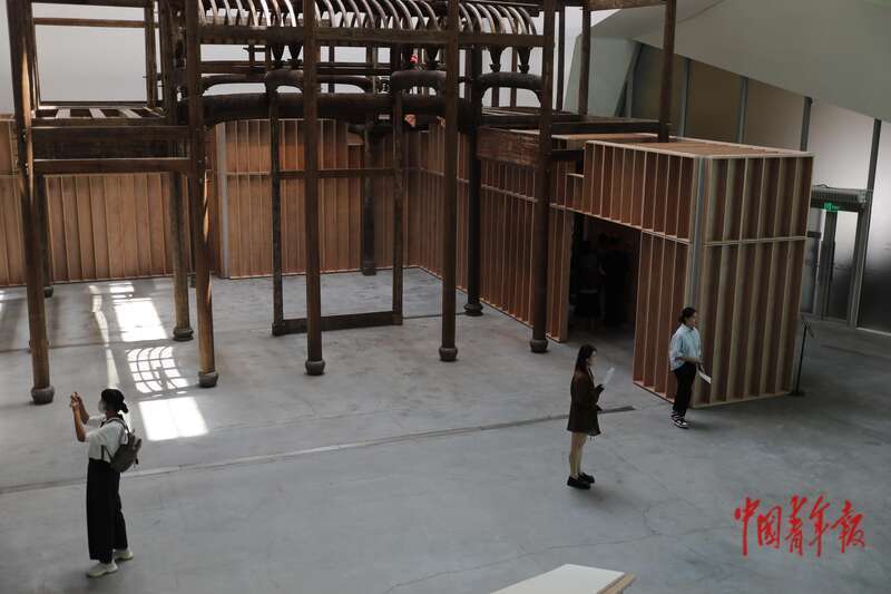 7月18日,北京民生美术馆,“山水有清音 安徽文化艺术大观”展览现场,参观者在拍摄展厅中的徽派建筑木结构复原件。中青报·中青网记者 孔斯琪/摄