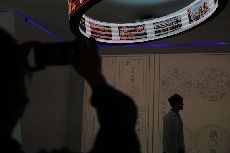 7月18日,北京民生美术馆,“山水有清音 安徽文化艺术大观”展览现场,参观者在展厅中的多媒体装置前拍照打卡。据悉,展览将持续至2025年10月30日。中青报·中青网记者 孔斯琪/摄