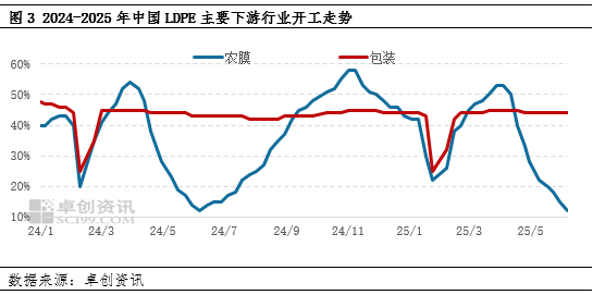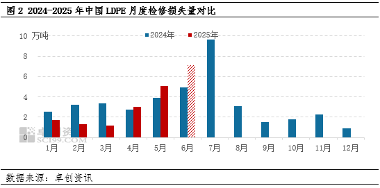整体来看,6月市场供应预计下降16.96%。据卓创资讯(301299)统计,2025年6月LDPE月度检修损失量预计达到7.12万吨,环比上涨40.43%。6月LDPE大修装置主要包括齐鲁石化(600002)、燕山石化、万华化学(600309)以及浙江石化,检修装置多集中在华北地区。6月LDPE国产量预计在24.98万吨,环比下降14.57%,华北地区国产量缩减幅度最大;受前期中美互加关税影响,贸易商前期从美国接盘明显减少,6月进口量存减少预期。